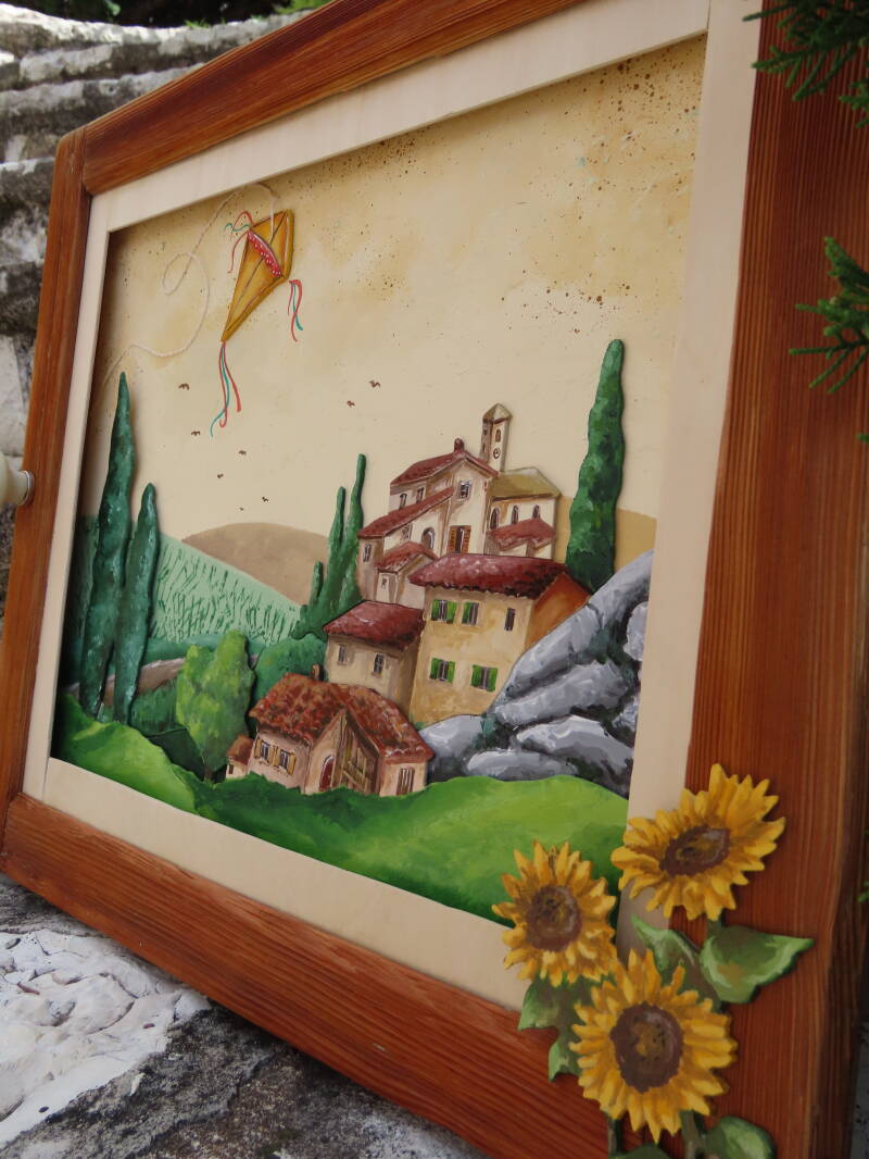 L'opera ritrae un classico paesaggio del centro Italia, in una calda giornata estiva. Il cielo volge al tramonto, e si è levata una brezza che invoglia i bambini a correre con gli aquiloni..il paese sembra assopito, circondato dal verde intenso delle praterie circostanti, dai cipressi e le dolci colline che degradano sullo sfondo. Lo sguardo è catturato dall'aquilone in alto, colorato e vivace, legato da un sottile spago (vero) tenuto ben saldo da una manina fuori dalla nostra visuale..