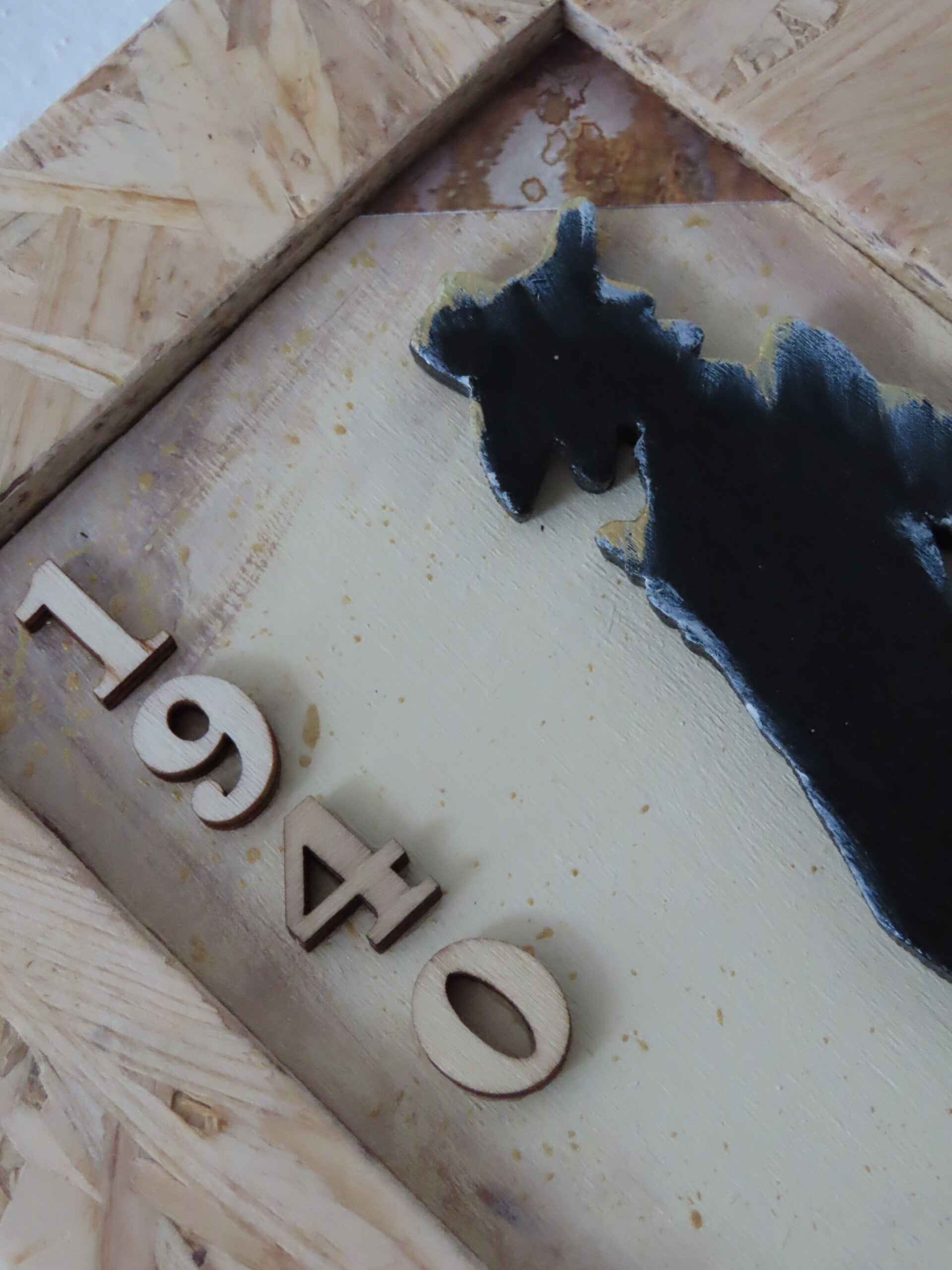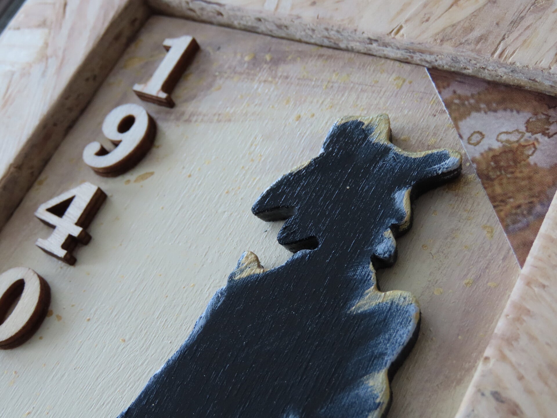 Pittura con colori acrilici, vernice ad acqua, colla per legno, numeri in legno, carta decorativa
