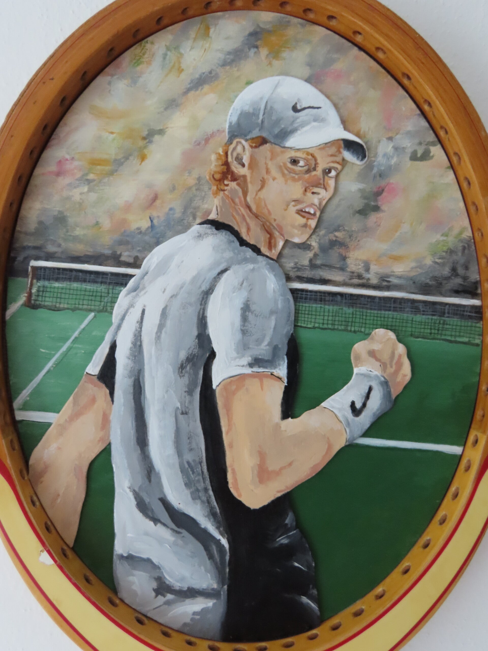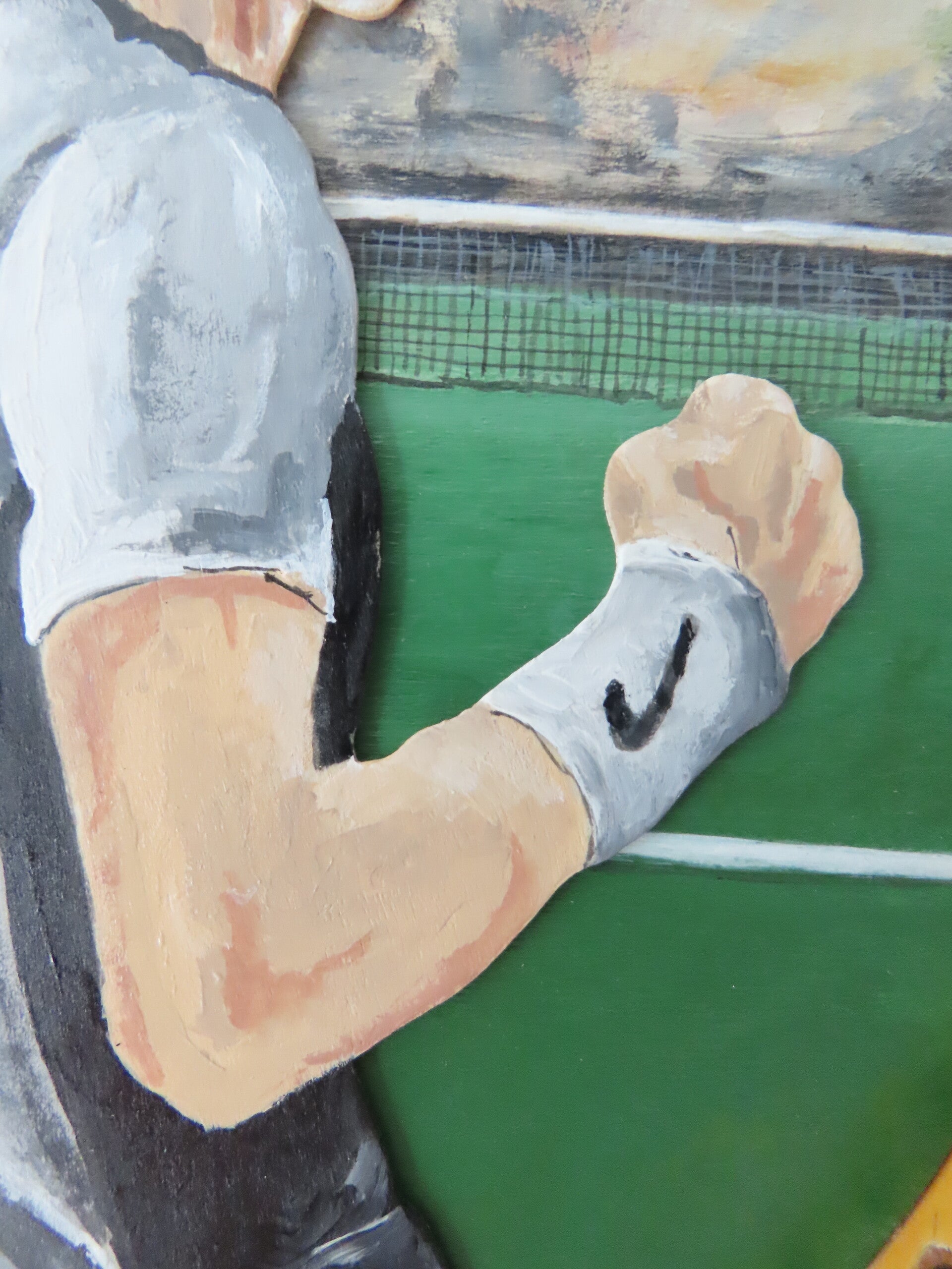 L'opera è inserita nel piatto corde di una racchetta da tennis vintage anni 70 (da collezione), con segni del tempo e utilizzo volutamente lasciati.